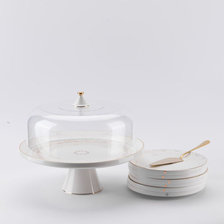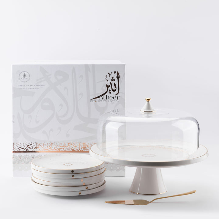 طقم تقديم الكيك 9 قطع من أثير- أبيض و ذهبي