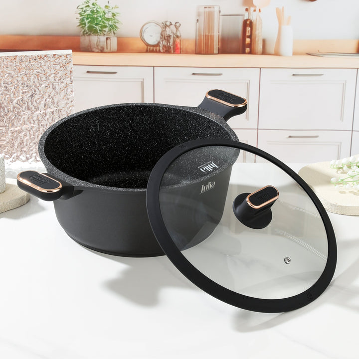 Elevate your everyday meals with the Julia Elite Pro Plus Casserole– a perfect blend of style, performance, and durability. This 24cm non-stick Casserole features a sleek black exterior and a double-layer black marble non-stick interior that is PTFE- and PFOA-free, ensuring safe, healthy cooking with easy food release and simple cleanup.