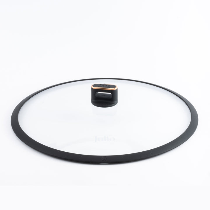 Designed for comfort and control, it includes a heat-resistant silicone handle and knob, along with a tempered glass lid featuring a steam vent for moisture control and clear visibility while cooking.
