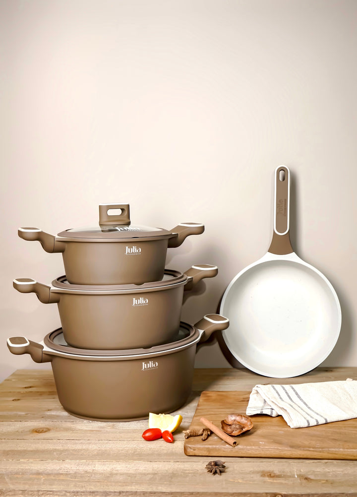 Transform your everyday cooking with the Julia Elite Prof Cookware Set, a 7-piece collection designed for both performance and sophistication. Finished in an elegant matte brown with a durable two-layer black marble non-stick interior, this set is PTFE & PFOA free, promoting healthier cooking with effortless food release and easy cleanup.