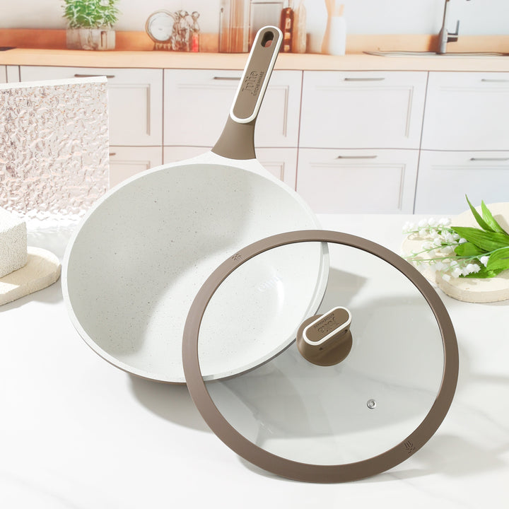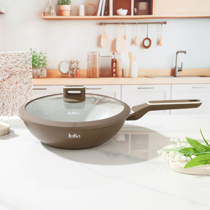 Elevate your everyday cooking with the Elite-Prof Wok Pan. Expertly crafted for both style and performance, this 28cm wok features a rich brown exterior and a durable two-layer beige marble non-stick interior that is PTFE & PFOA free, ensuring safe, healthy cooking with effortless food release and easy cleanup.
