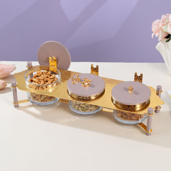 طقم تقديم مكسرات 3 قطع مع صينية من جوار - نهدي و ذهبي